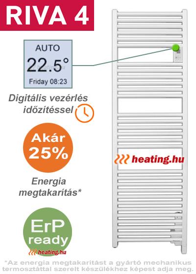 A Riva 4 elektromos törölközőszárító teljes értékű, energiatakarékos elektromos fűtés. Gazdaságos fürdőszobafűtés, ugyanakkor szárító is egyben. A fűtőkészülék megfelel a szigorú európai energetikai előírásoknak, így ErP reday minősítéssel rendelkezik. A fűtőtest háromféle teljesítménnyel elérhető, ami azt jelenti, hogy a fürdőszoba méretének megfelelőt választhat. Hőközlő folyadékkal töltött, csövekből összeállított, nyomás és korrózióálló fűtőtest. Az elektromos törölközőszárító működését fejlett elektronika felügyeli, amely olyan energiafelhasználás csökkentő funkciókat tesz lehetővé, mint a programozás a hét napjaira, vagy a BOOST fokozat. Rendkívül esztétikus, selyemfehér fényezéssel és jól áttekinthető LCD vezérlő panellel rendelkezik. Megjelenésénél fogva a legigényesebb fürdőszobában is jól megállja a helyét. Bár az IP 24 védettségű fűtőpanelek is felszerelhetők fürdőszobában, ezeken szárítani nem lehet, ezért a Riva 4 törölközőszárító radiátor azok számára ajánlott akik a szárítás és a fűtés problémáját egy fűtőkészülékkel szeretnék megoldani.